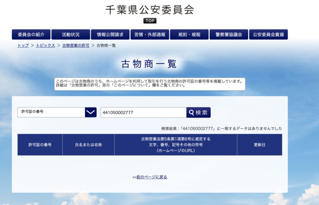 また、古物商許可証番号:第441050002777号を千葉県公安委員会古物商一覧で調べましたが、「441050002777」の登録番号を見つけることはできませんでした。