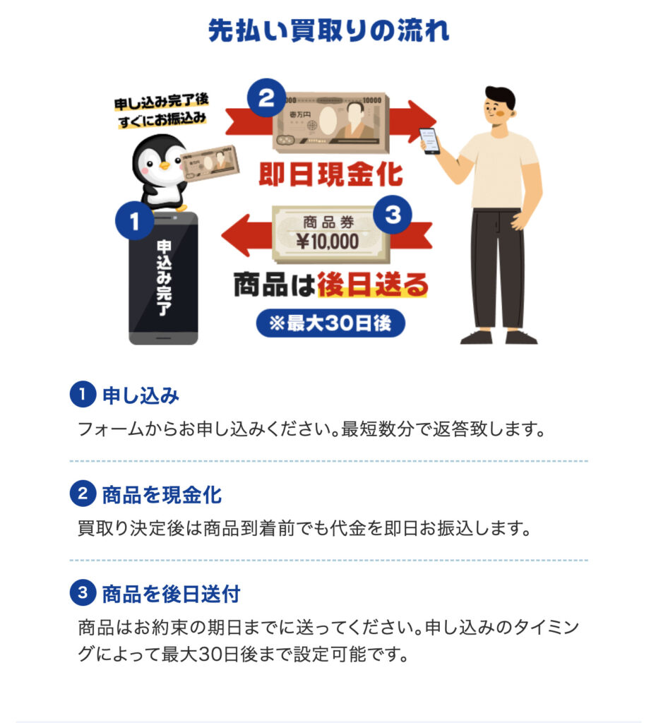 買取業者を装っていますが、実際には商品が手元になくても代金が支払われる、いわゆる「先払い買取」を行なっている業者です。